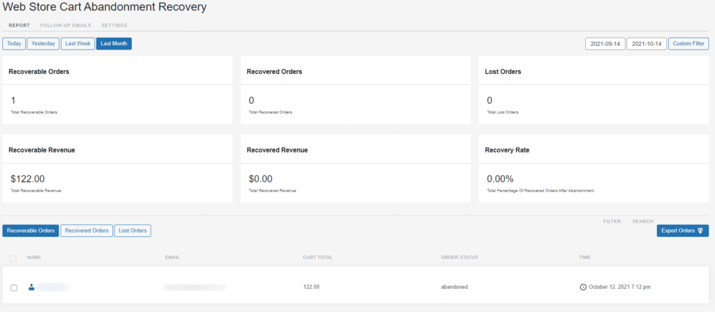 In the top menu bar, go to Web Store and then click Cart Abandonment Recovery. That will bring up your Cart Abandonment Recovery overview, where you can see: