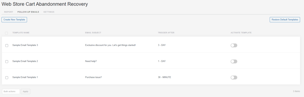 Three pre-made emails you can use. You can also edit them, or create your own. To activate the email, click the “Activate Template now” button on the top left of the screen.